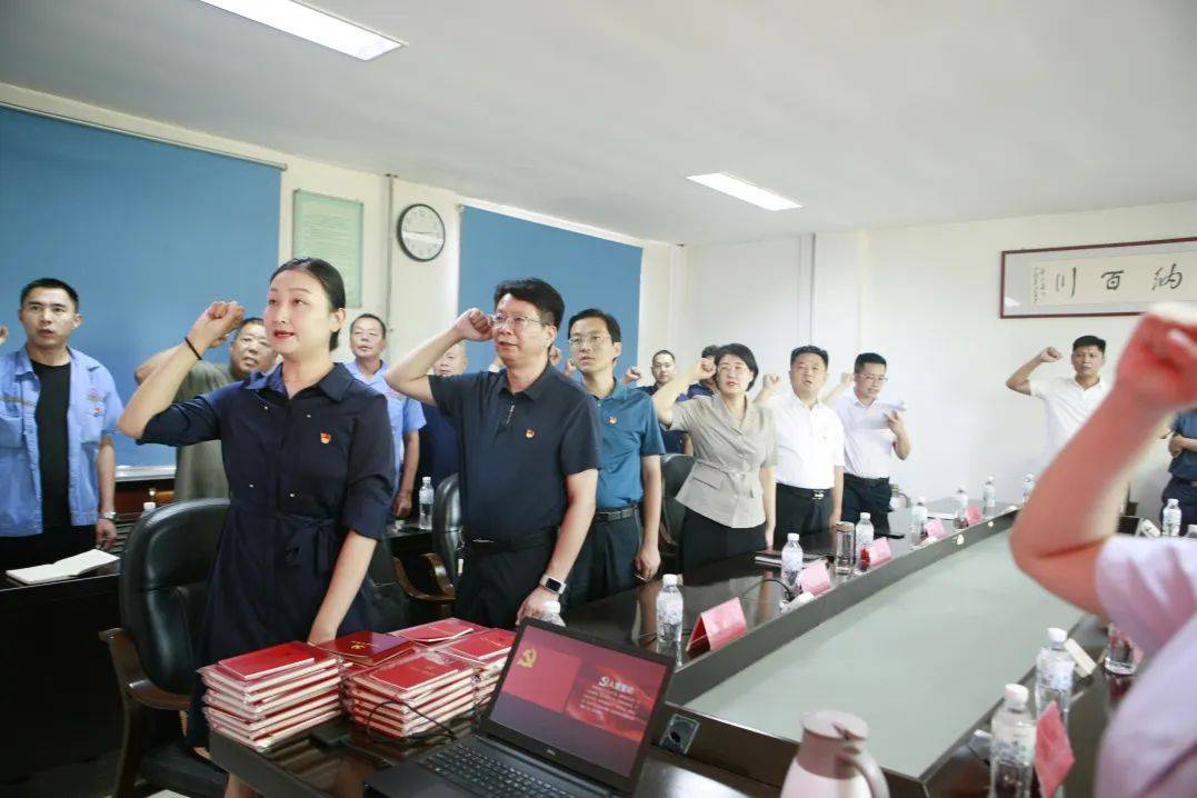 一场庄重的入党宣誓。6月27日,在鲜红的党旗下,新发展的2名预备党员郑重宣誓,其他老党员们一起重温入党誓词,大家庄严肃立、高举右手、握紧拳头,一起诉说对党忠诚,以更加坚定的理想信念投身枣庄工业经济的再次腾飞。