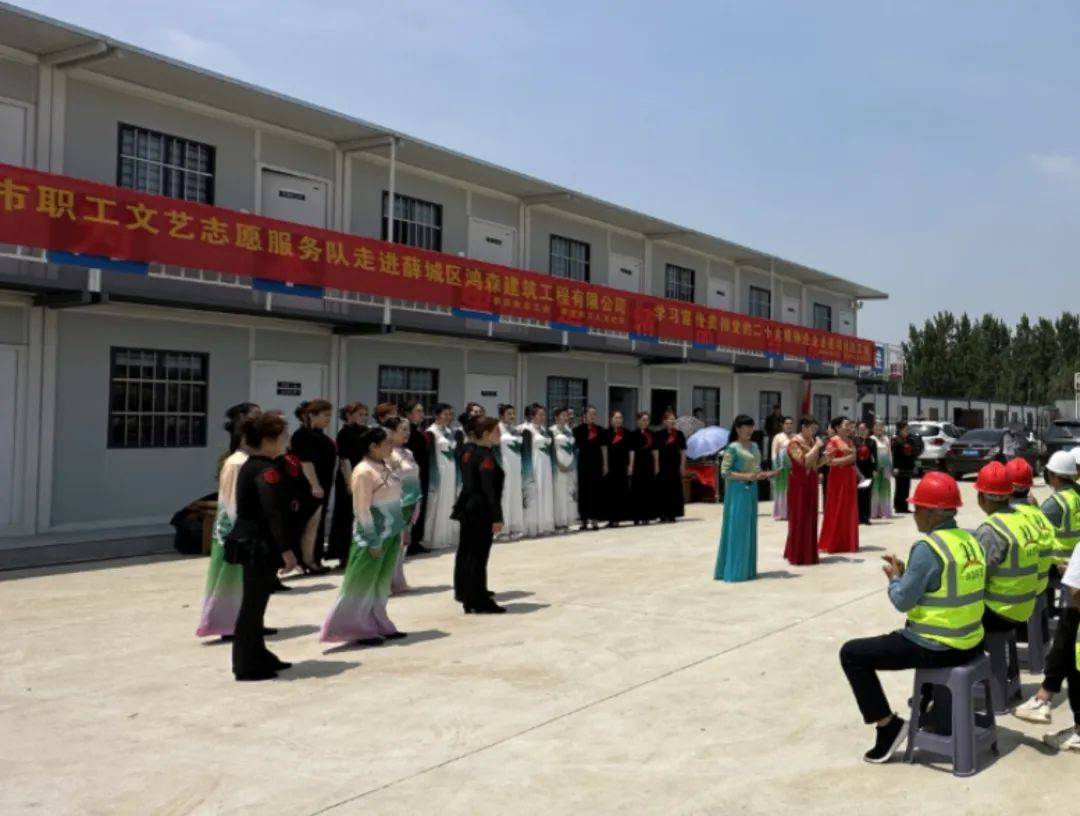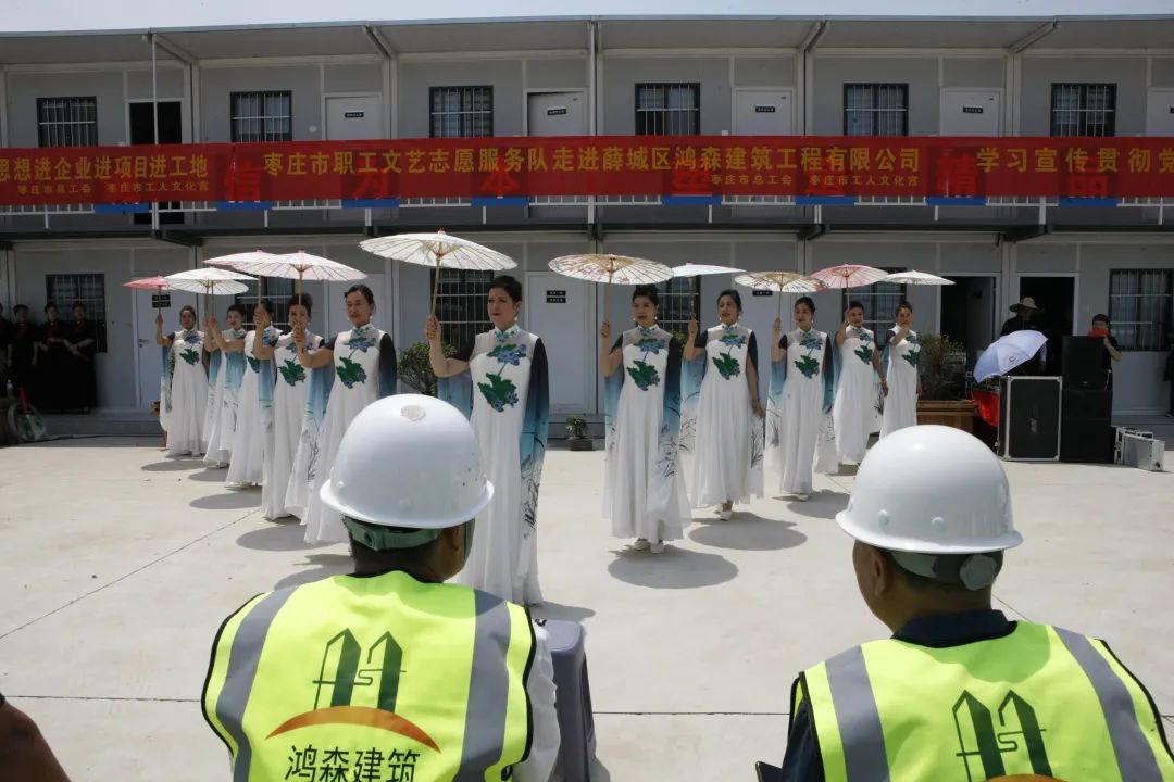 启动仪式结束后,职工文艺志愿服务队启程前往薛城区鸿森建筑工程有限公司曹沃回迁项目部开展首场演出。演出在《咱们工人有力量》的热烈氛围中拉开帷幕,朗诵《党的二十大之歌》、集体快板舞《劳动托起中国梦》展示出职工锐意进取的精神风貌,赢得台下观众阵阵掌声;舞蹈《江北水韵》、走秀《中国风》、朗诵《读中国》向现场职工倾情传达薪火相传、接续奋斗的心声。走秀《向二十大敬礼》、舞蹈《微山湖》短小精彩、深受职工欢迎。整场演出在全场职工齐唱《歌唱祖国》的歌声中落下帷幕。